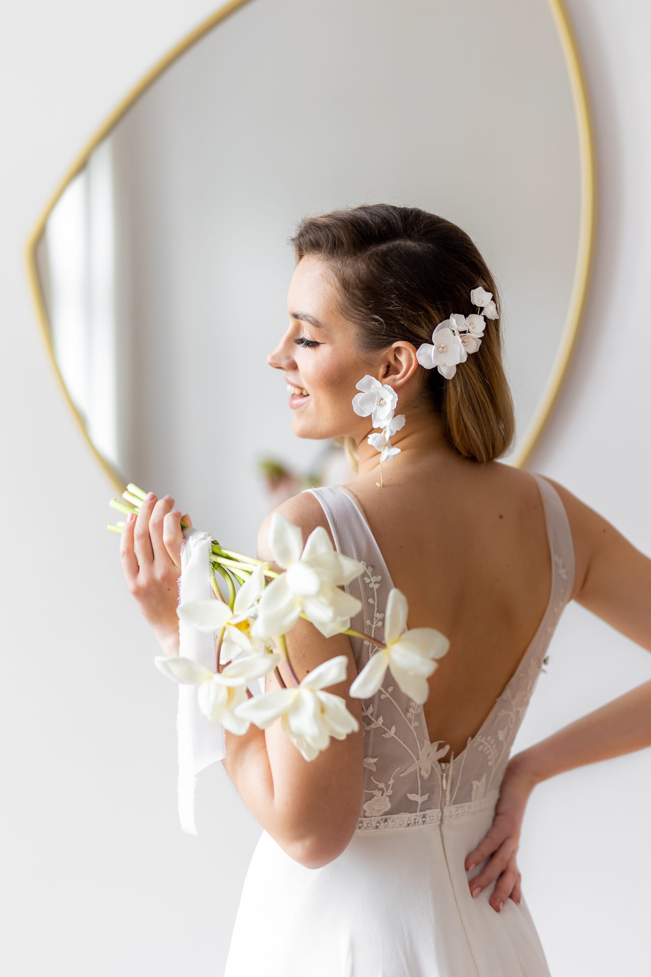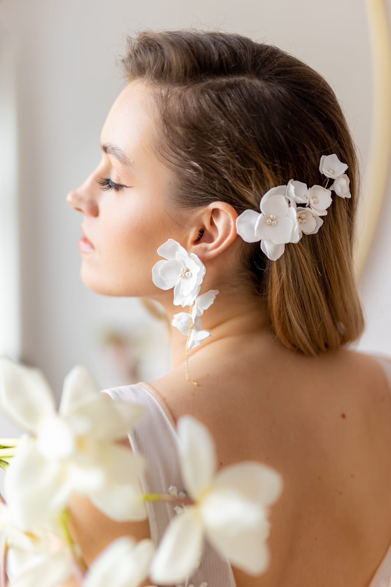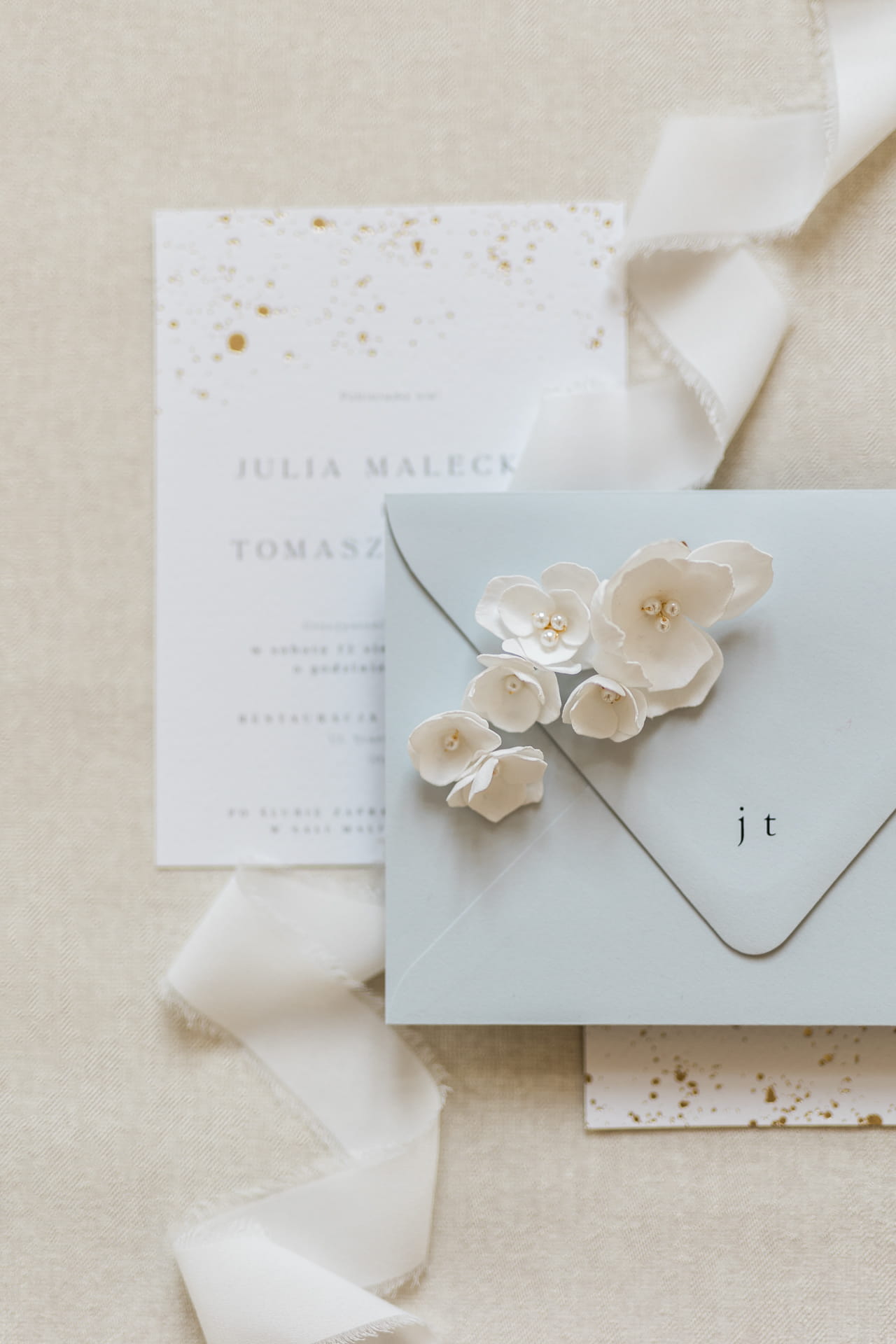 - wykończona ręcznie wykonanymi, delikatnymi kwiatami w białej kolorystyce, delikatnie połyskującymi perełkami